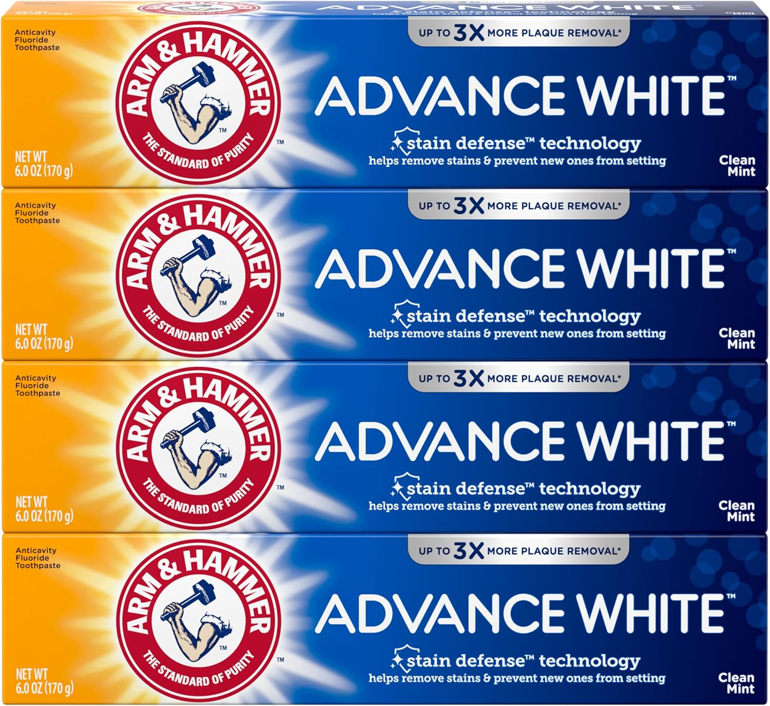 - Four 6.0 oz tubes of ARM & HAMMER Advance White Toothpaste, Teeth Whitening Baking Soda Toothpaste with Stain Defense Technology, Fluoride Toothpaste, Clean Mint Flavor
